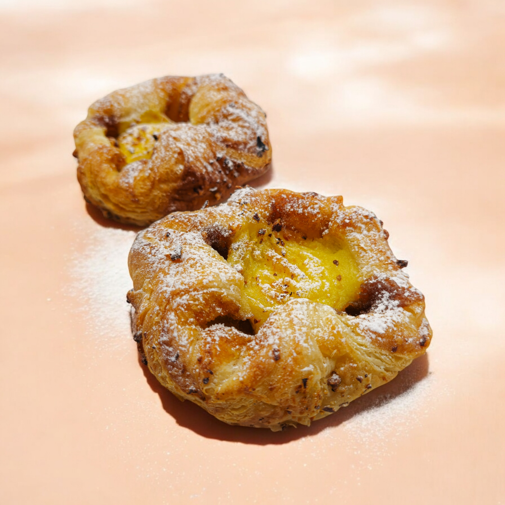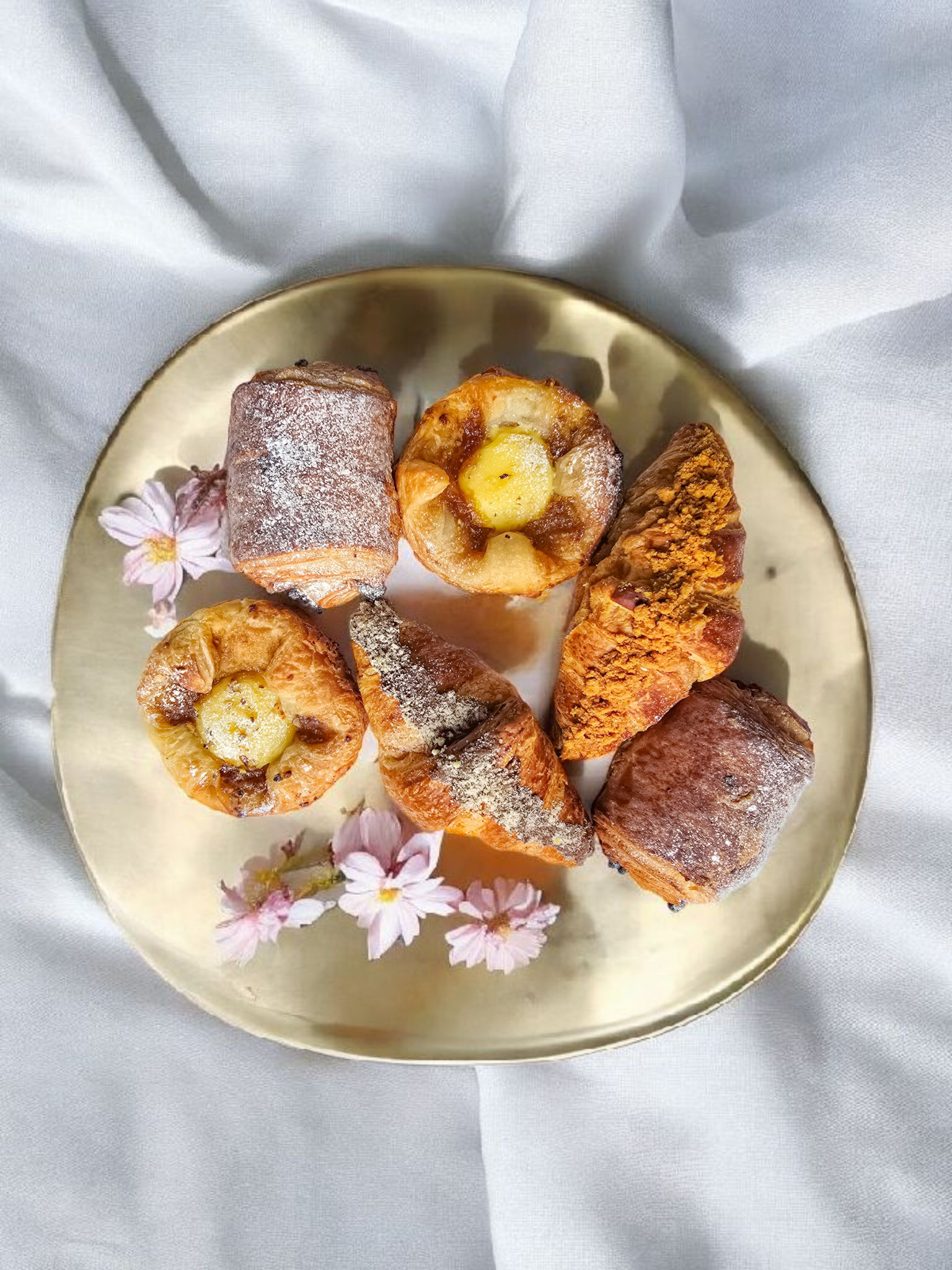 A delightful assortment of 6 luxury handmade vegan pastries - perfect for a breakfast treat or a thoughtful gift, all crafted with plant-based ingredients and bursting with flavour.
