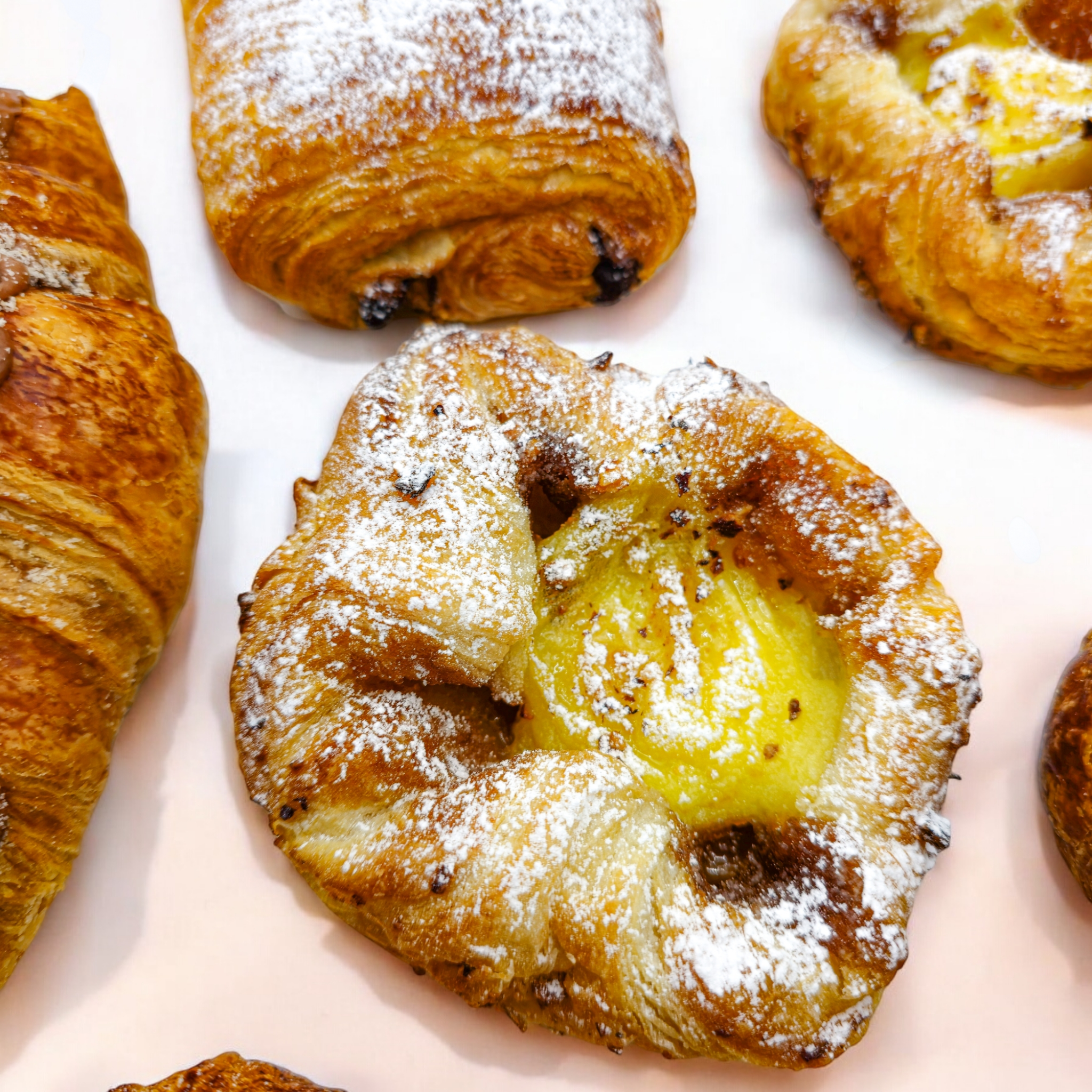 Each Regular box contains 2 Hazelnut & Custard Danish crown's, 2 flavoured Croissant's of your choice, and 2 Pain Au Chocolat